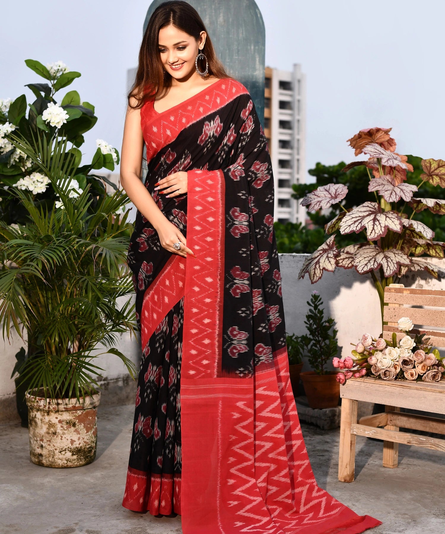 This Black Ikkat Pure Cotton Pochampalli Saree exudes sophistication and style. Its bold color and intricate patterns make it a standout piece for any special occasion.