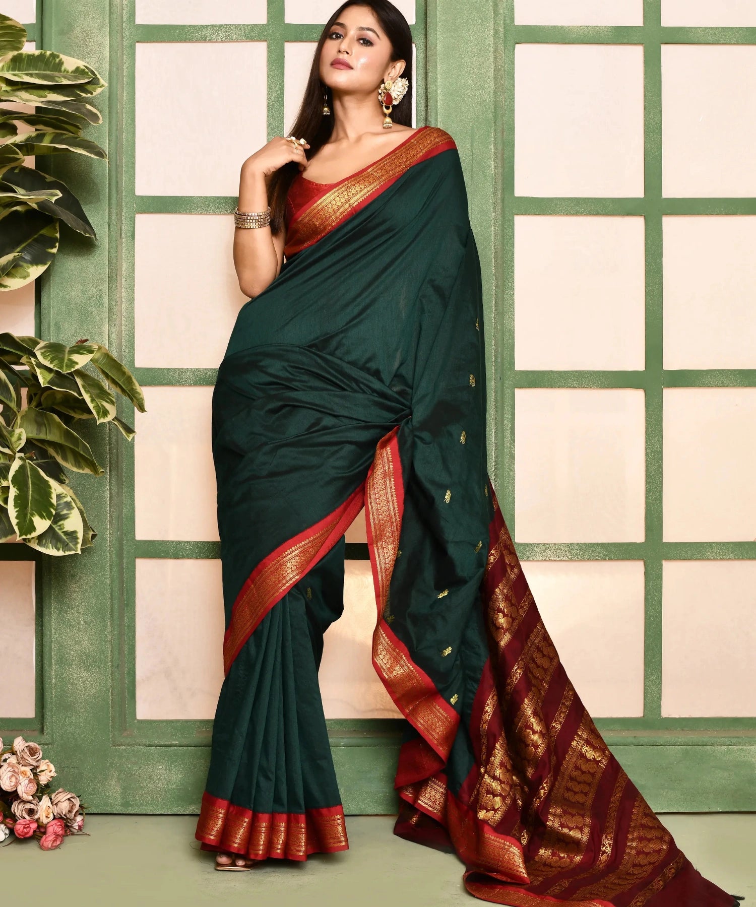 Bottle Green-Maroon Kalyani South Cotton Silk Handloom Saree
