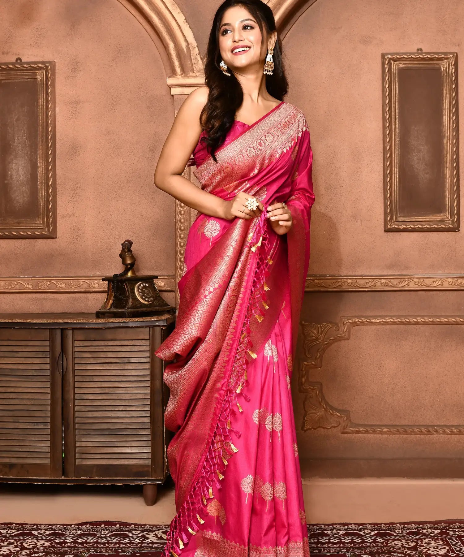 This Coral Pink Benarasi Khaddi Silk saree brings a soft yet vibrant touch to your wardrobe, perfect for any festive gathering.