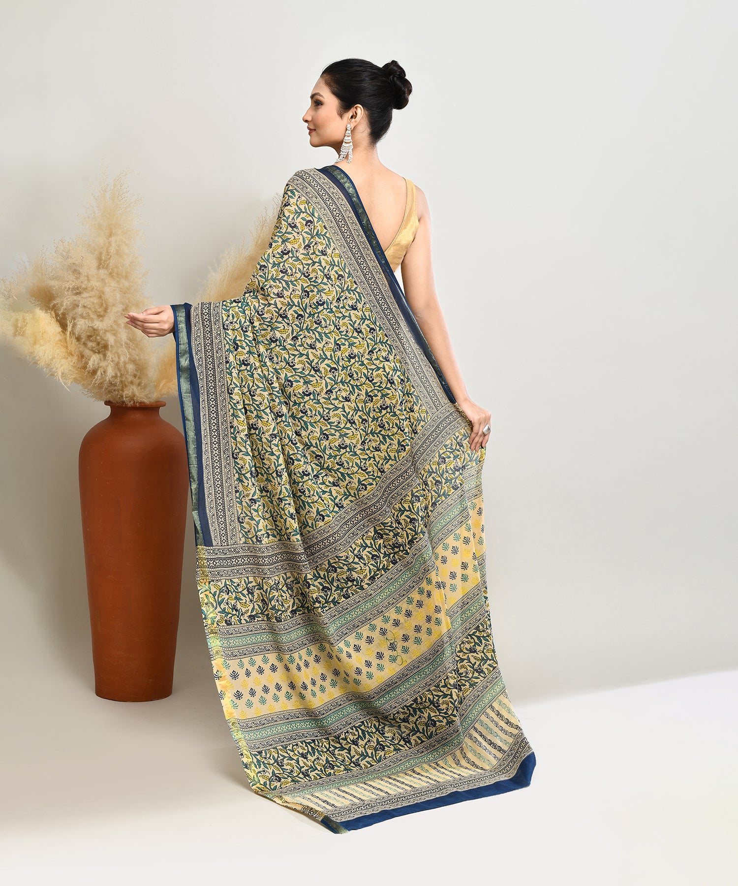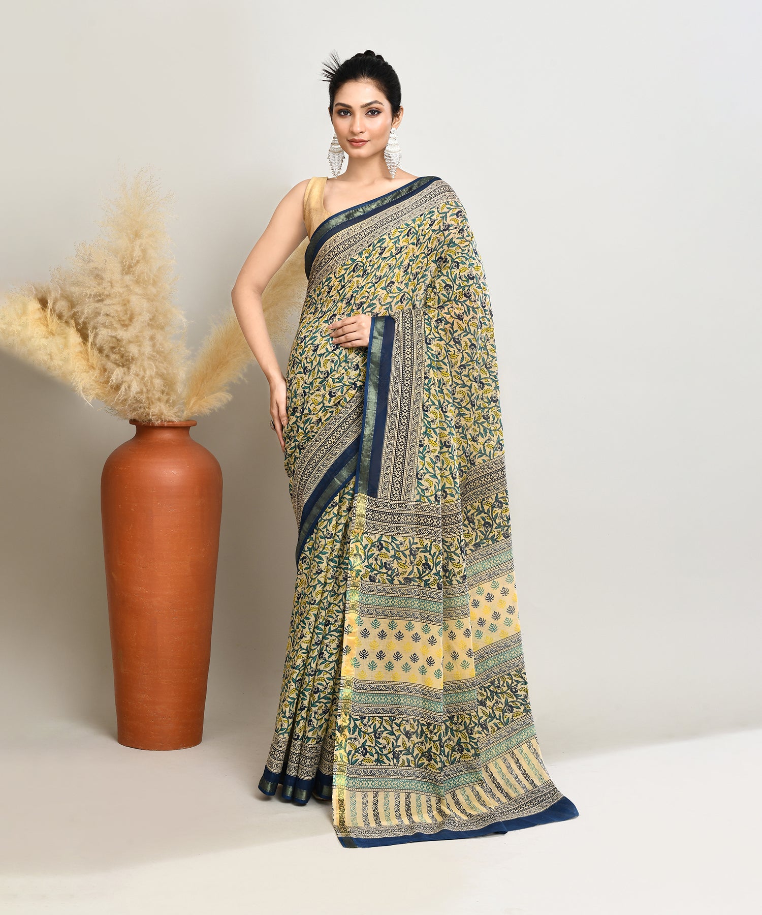 Wrap yourself in heritage charm with our Cream-Blue Pure Bagru Pashmina Kalamkari Printed Sico Chanderi Saree. Adorned with intricate Kalamkari motifs in soothing Bagru tones, this saree beautifully blends tradition with elegance. The silk-cotton fabric offers a soft, airy drape, making it a timeless addition to your wardrobe.