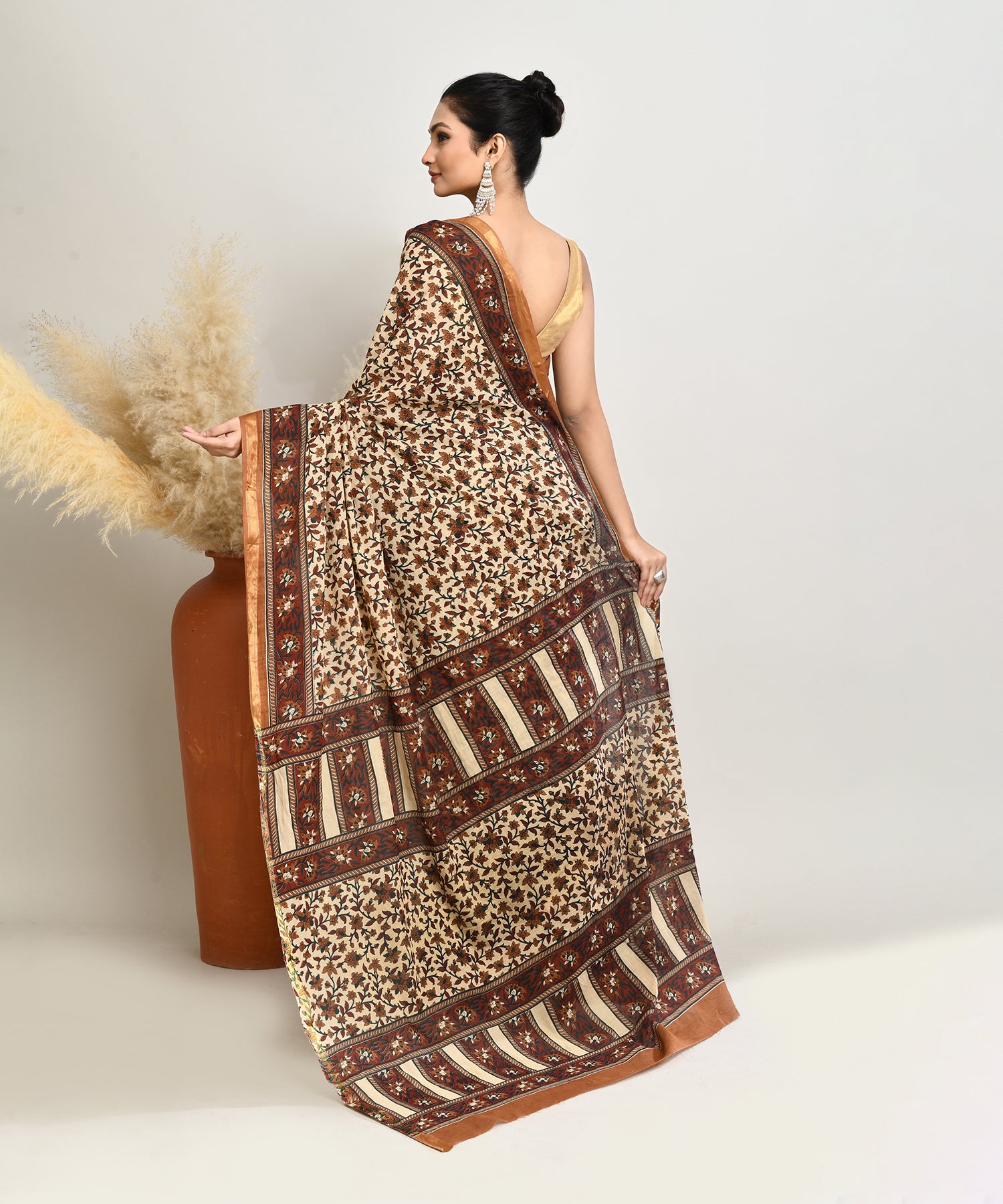 Wrap yourself in heritage with our Cream-Brown Pure Bagru Pashmina Kalamkari Printed Sico Chanderi Saree. Adorned with intricate Kalamkari motifs in earthy Bagru tones, this saree is a tribute to traditional craftsmanship. The silk-cotton blend ensures a soft, luxurious drape, making it a timeless addition to your wardrobe.