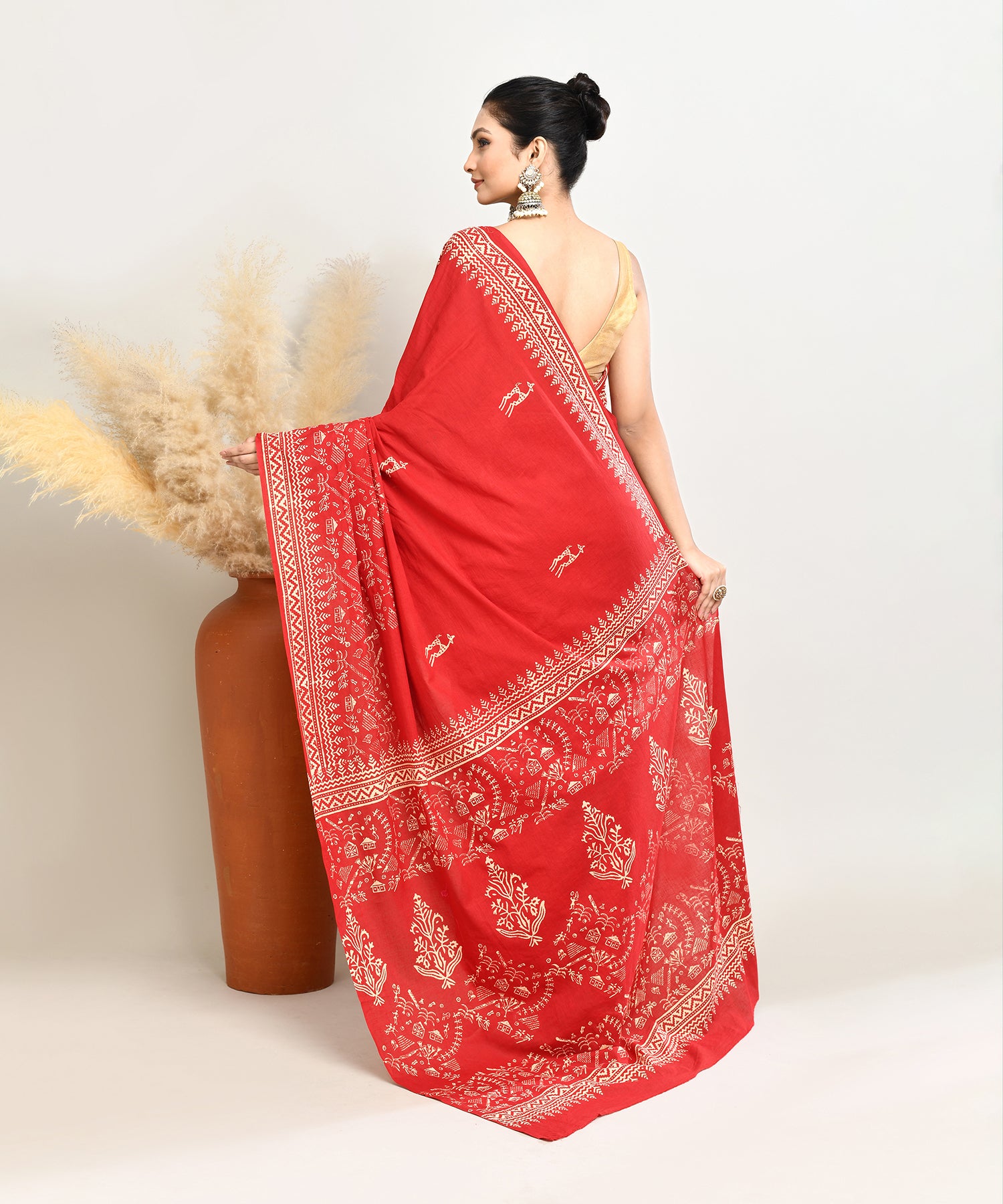 Wrap yourself in timeless elegance with our Deep Red Pure Light and Breezy Dabu Discharge Handblock Printed Premium Cotton Saree. Crafted using the traditional Dabu discharge printing technique, this saree features intricate patterns on a rich red base. The lightweight premium cotton ensures breathability and a soft, graceful drape, making it perfect for effortless comfort and style.