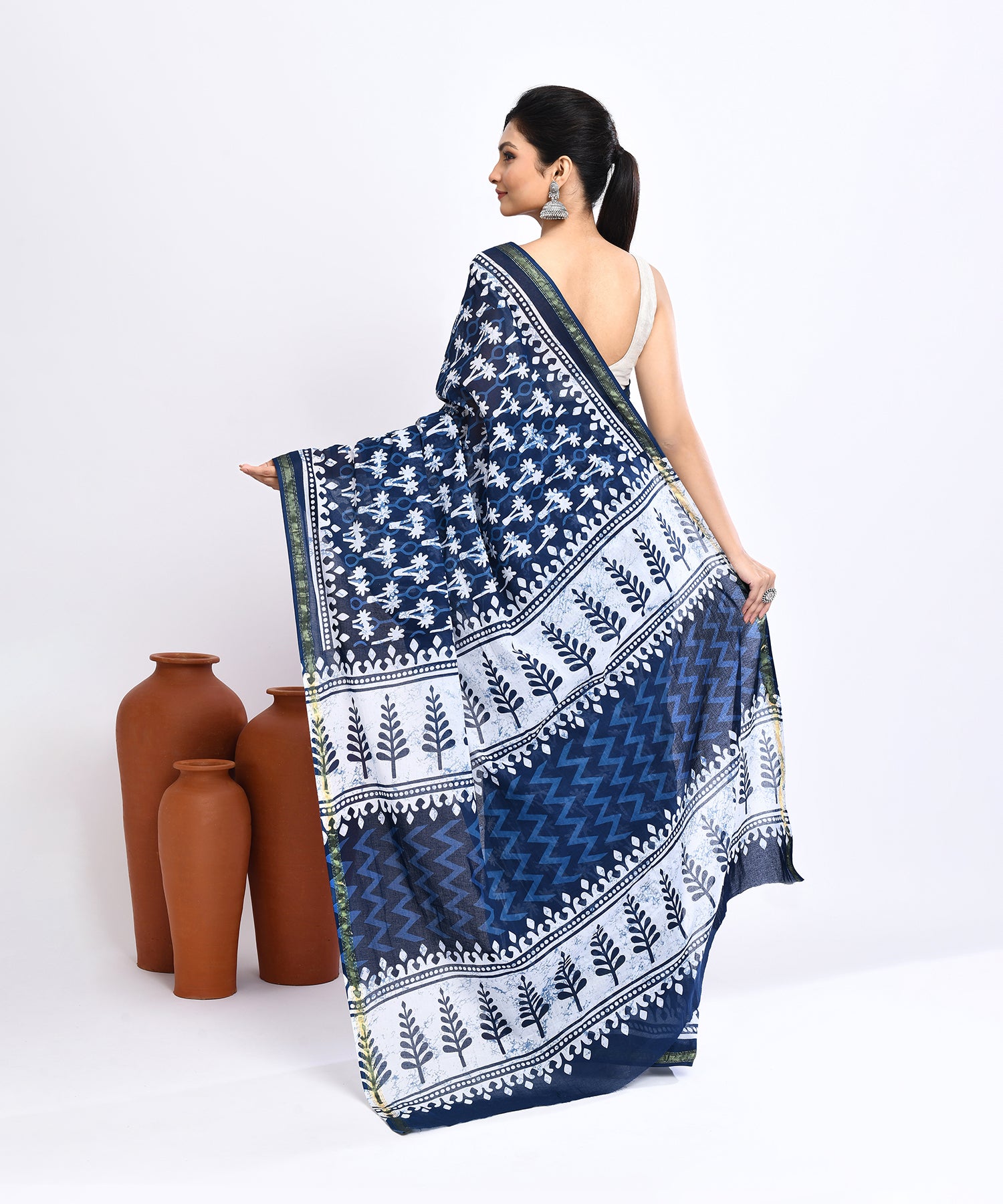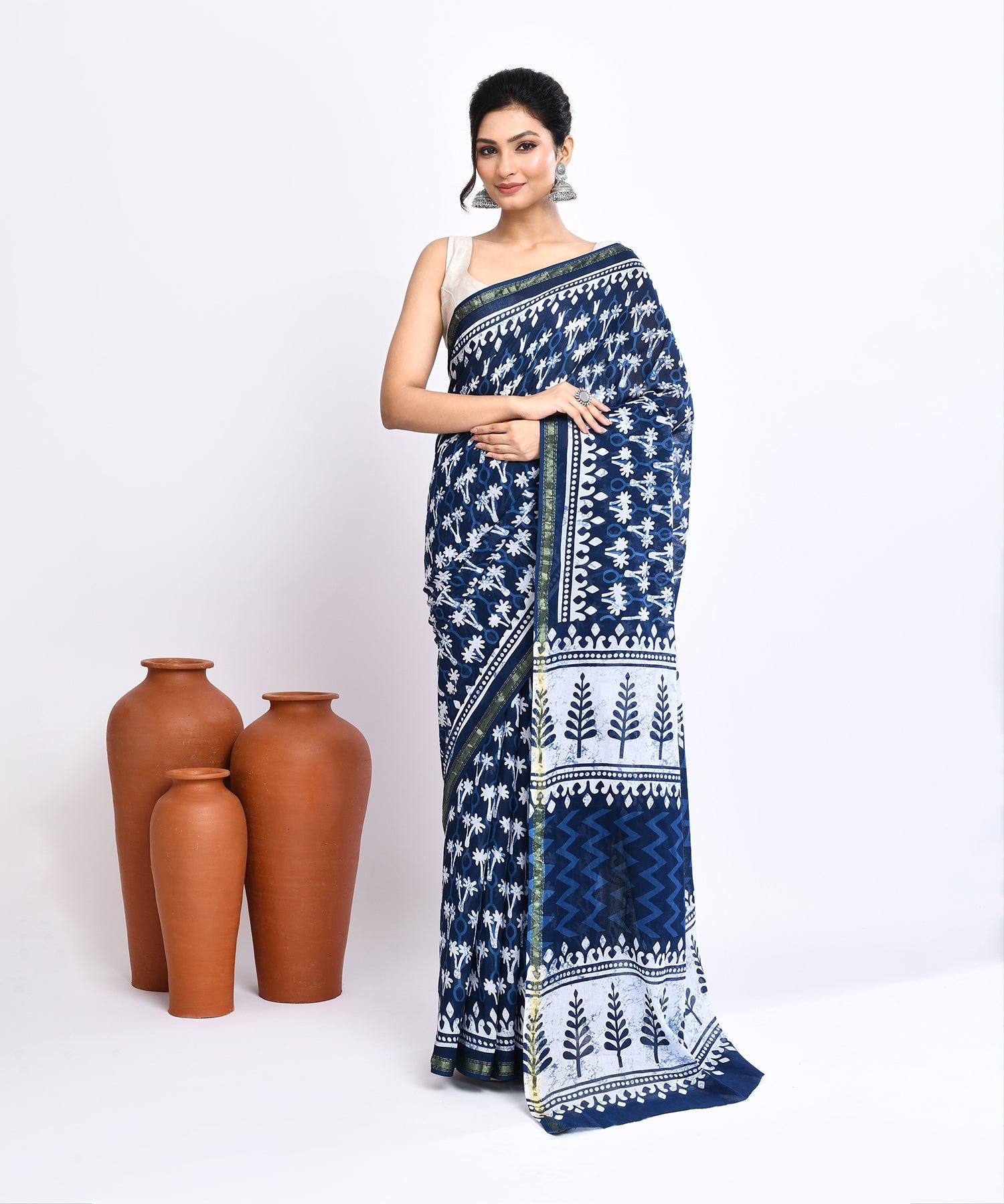 Experience the elegance of handcrafted tradition with our Indigo Pure Dabu Twin Flower Handblock Printed Sico Chanderi Saree. Adorned with intricately printed twin flower motifs, this saree is created using the age-old Dabu technique on a deep indigo base. The silk-cotton blend offers a soft, airy drape, making it a perfect choice for effortless grace and timeless charm.