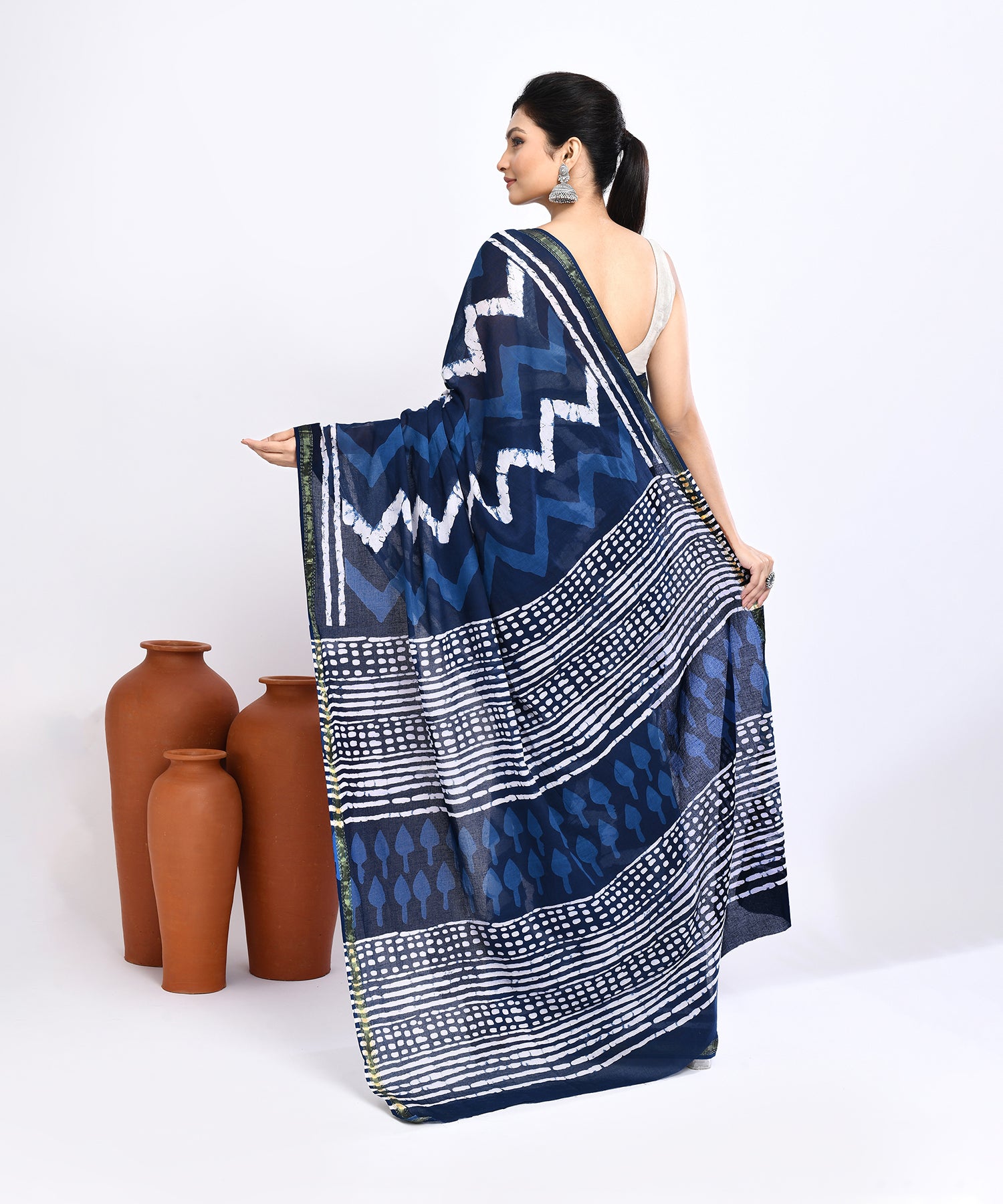 Wrap yourself in heritage with our Indigo Pure Dabu Zigzag Pattern Handblock Printed Sico Chanderi Saree. Crafted using traditional Dabu handblock printing, this saree features a striking zigzag pattern on a deep indigo base. The silk-cotton blend offers a soft, airy drape, making it a graceful choice for any occasion.