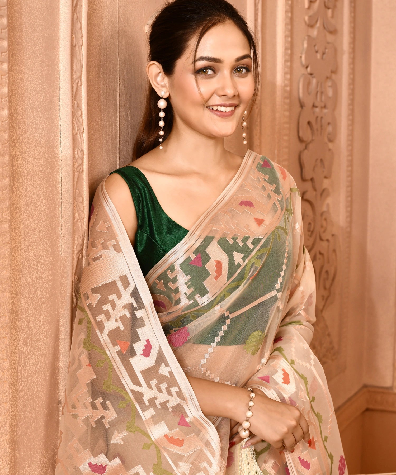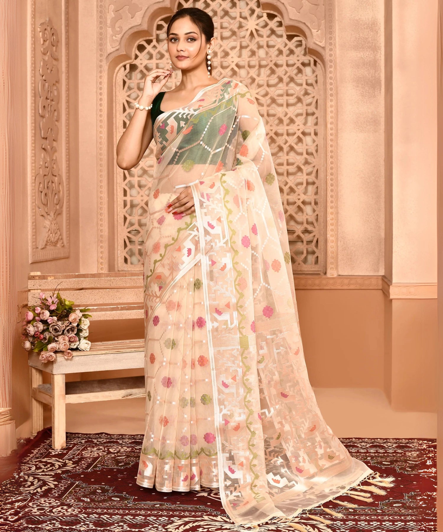 The Ivory Meenakari Organza Saree with geometric print blends delicate organza fabric with intricate Meenakari designs, ideal for modern ethnic fashion statements.