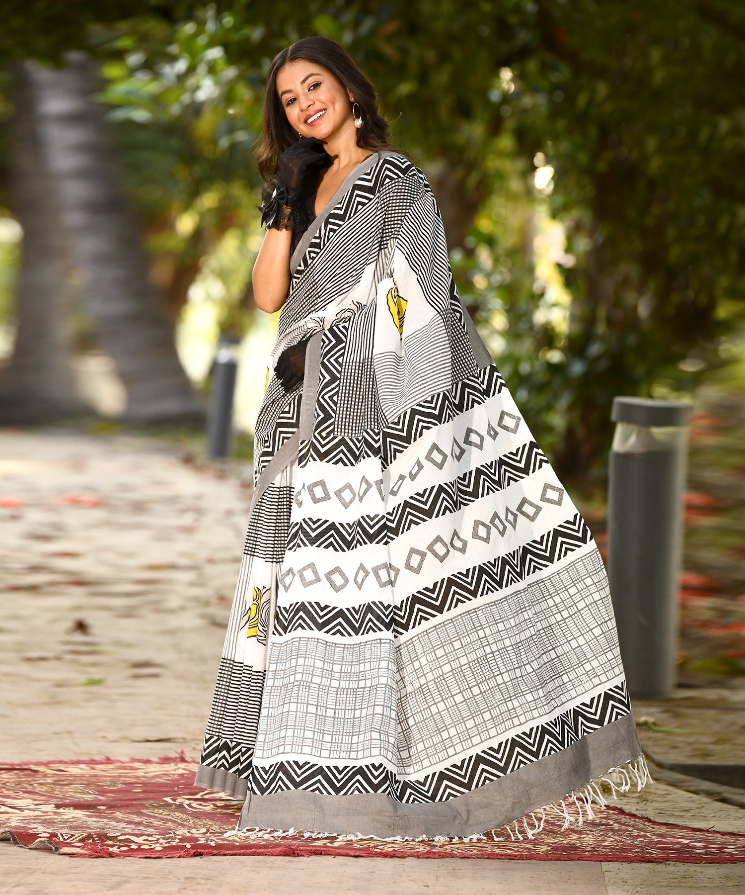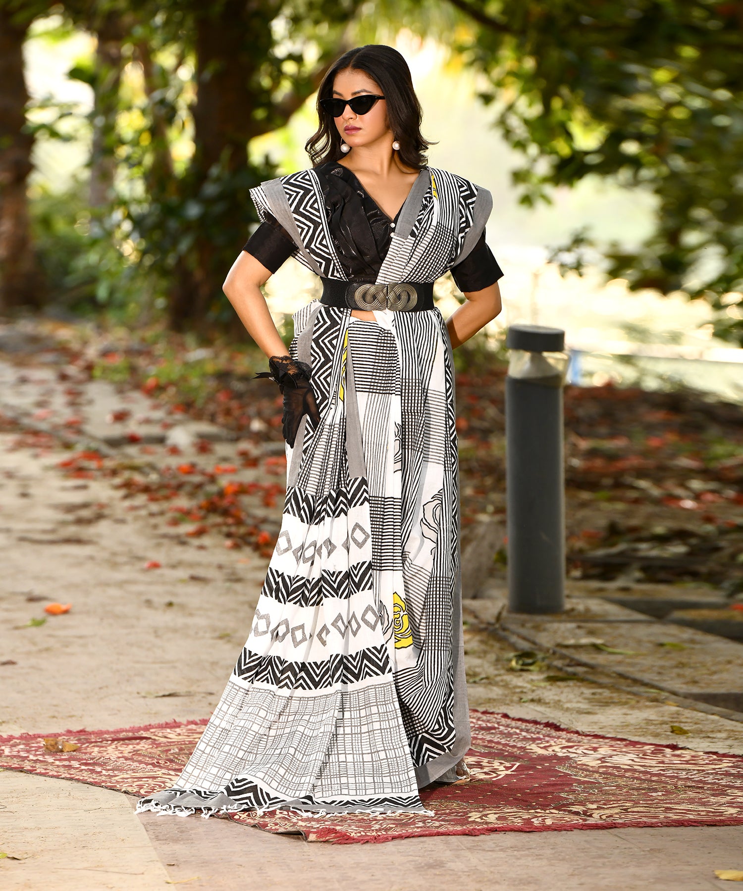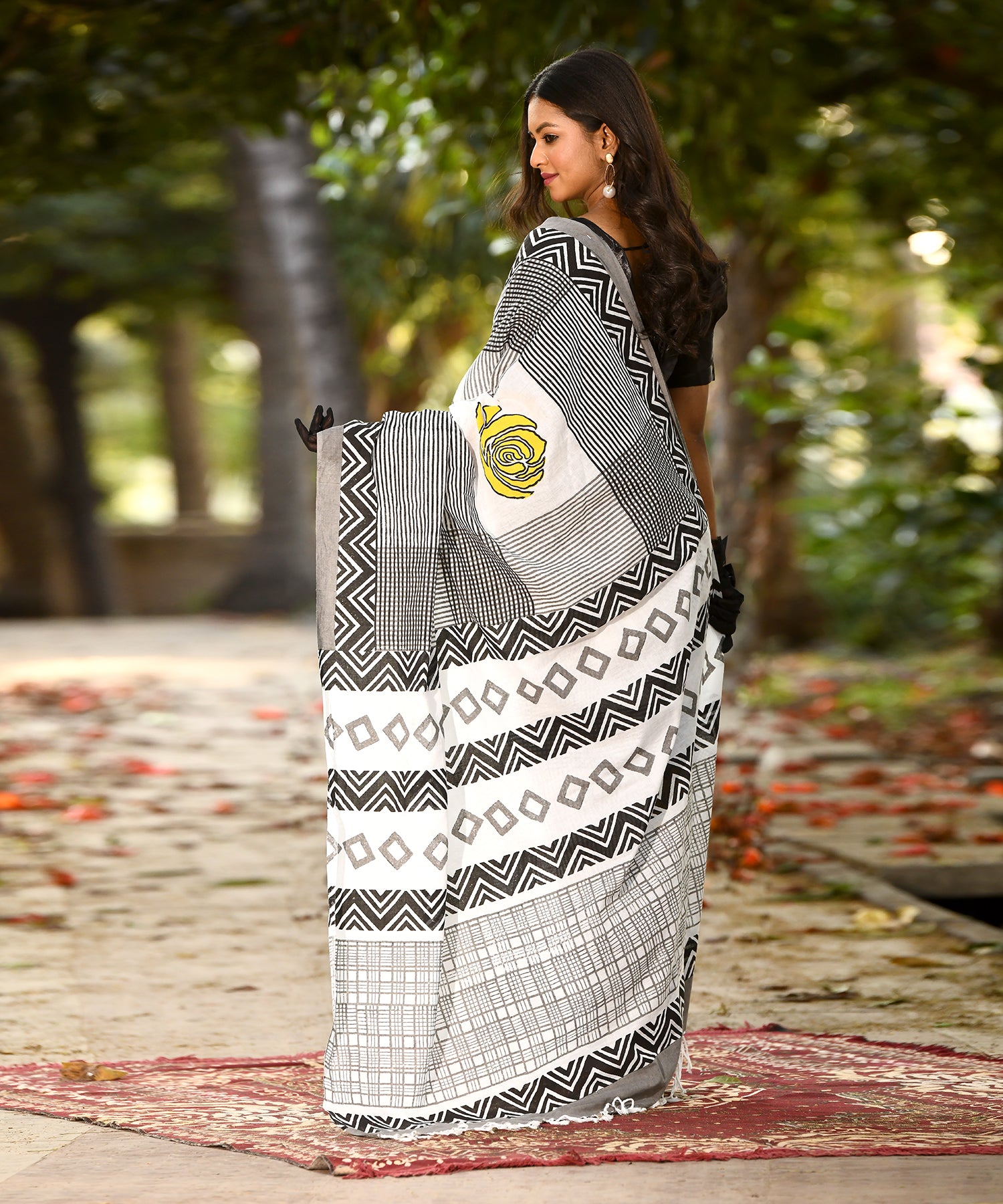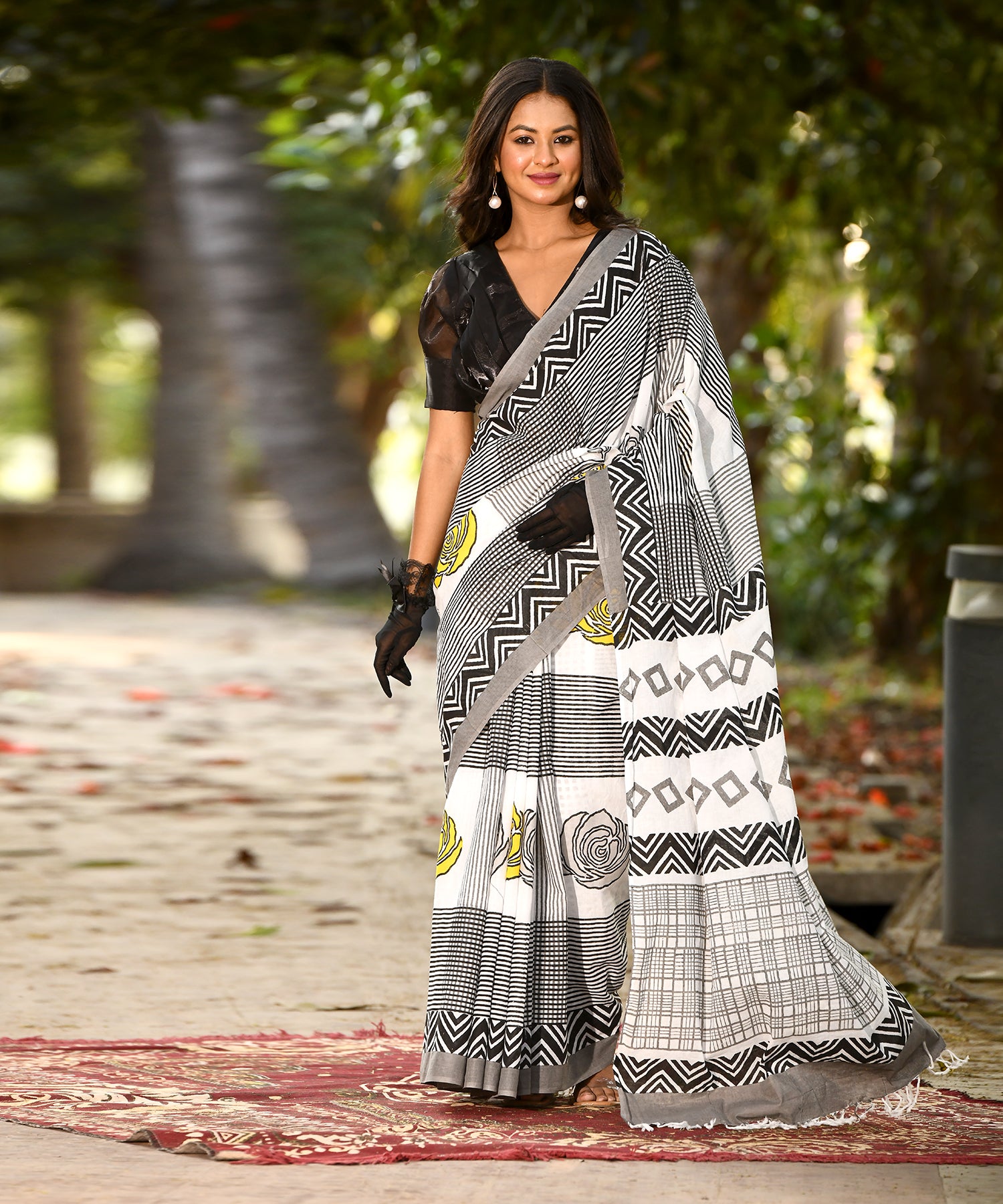 why u will love it- This saree is a total stunner – a black‑white geometric masterpiece with a pop of yellow accents that makes it feel fresh & modern. The crisp patterns and elegant fringe give it a chic, artistic vibe perfect for any occasion, from casual outings to festive gatherings. Its unique design will make you stand out, adding a sophisticated twist to your wardrobe while keeping the traditional saree charm alive. You’ll love wearing it because it blends contemporary style with classic elegance, giving you that confident, eye‑catching look every time you drape it. The delicate rose motifs add a romantic feminine touch to this classic monochrome masterpiece.