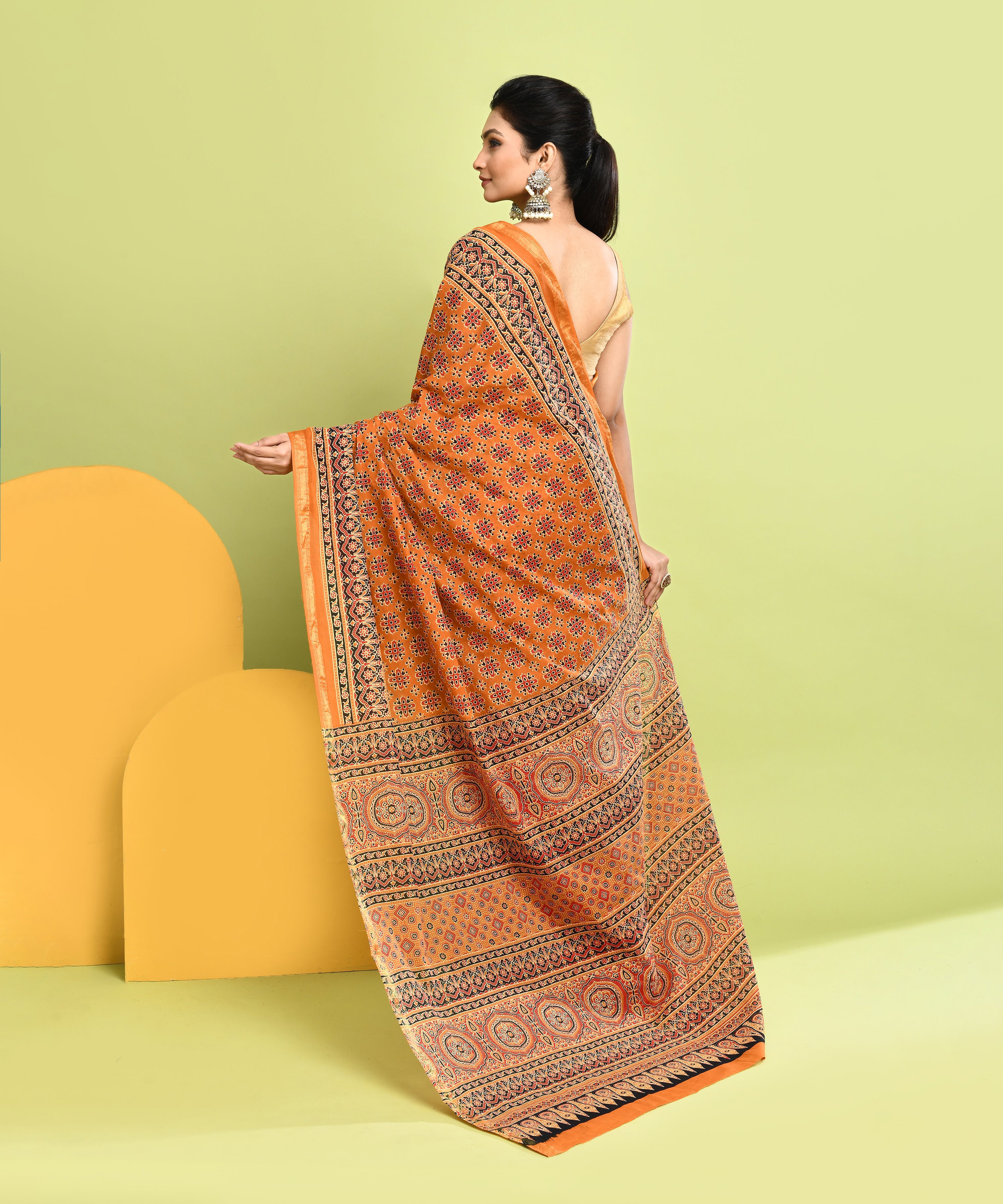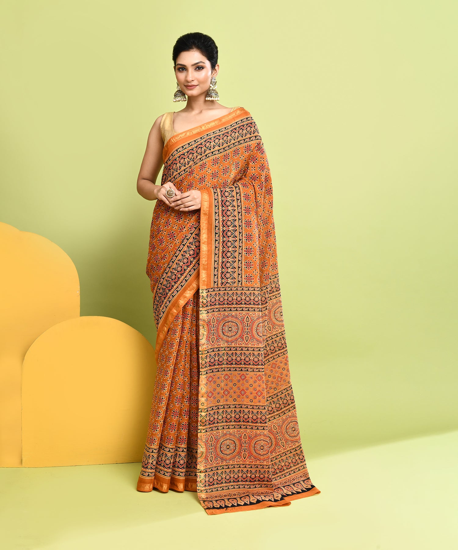 Immerse yourself in the timeless artistry of our Mustard Geometric Pure Ajrakh Handblock Printed Sico Chanderi Saree. Adorned with intricate geometric patterns, this saree is crafted using the traditional Ajrakh handblock printing technique on a rich mustard base. The luxurious silk-cotton blend offers a soft, airy drape, making it a perfect choice for effortless elegance.