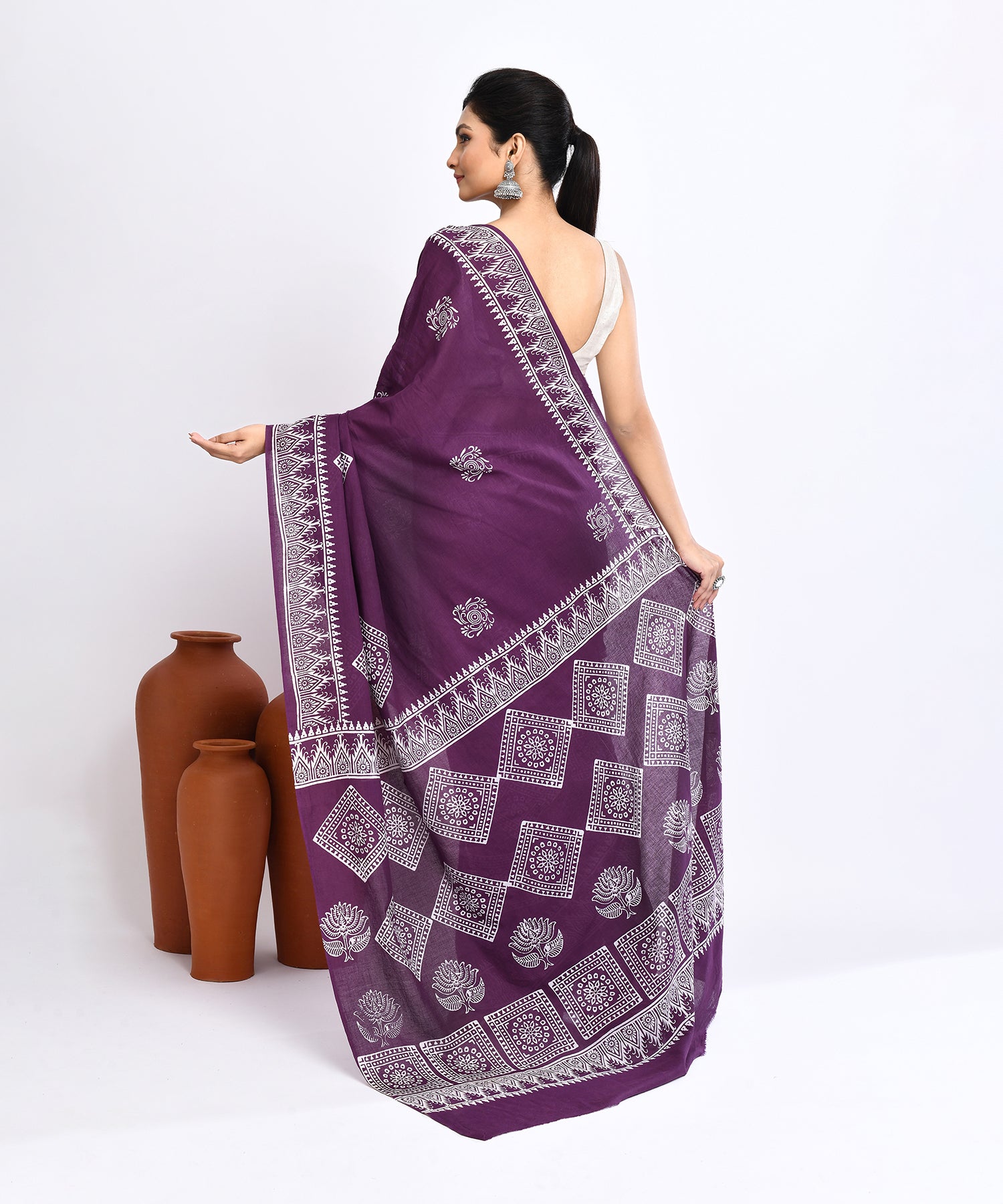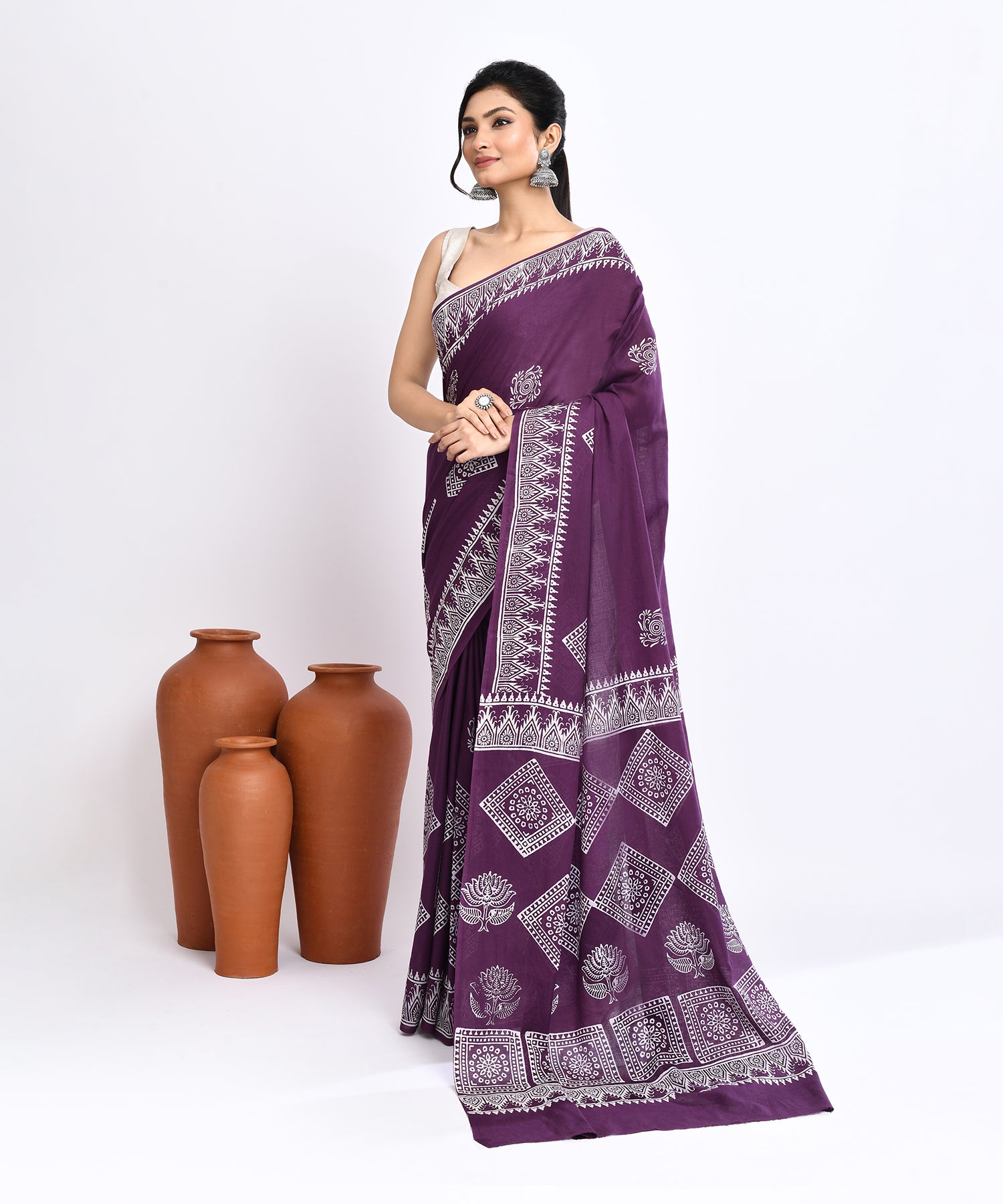 Embrace effortless grace with our Purple Pure Light and Breezy Dabu Discharge Handblock Printed Premium Cotton Saree. Showcasing intricate handblock patterns using the traditional Dabu discharge technique, this saree is designed for comfort and elegance. The lightweight premium cotton ensures breathability and a soft, fluid drape, making it perfect for any occasion.